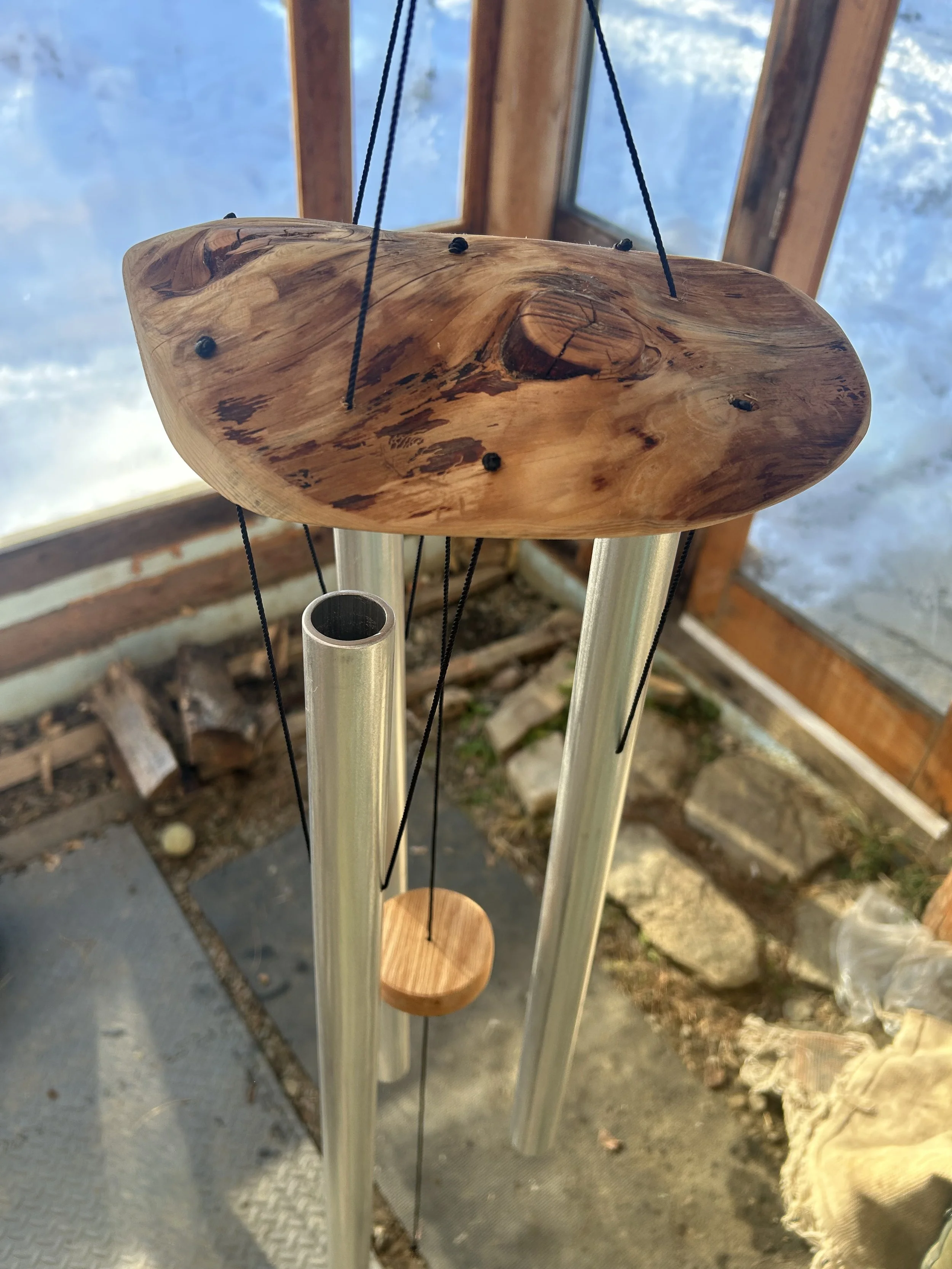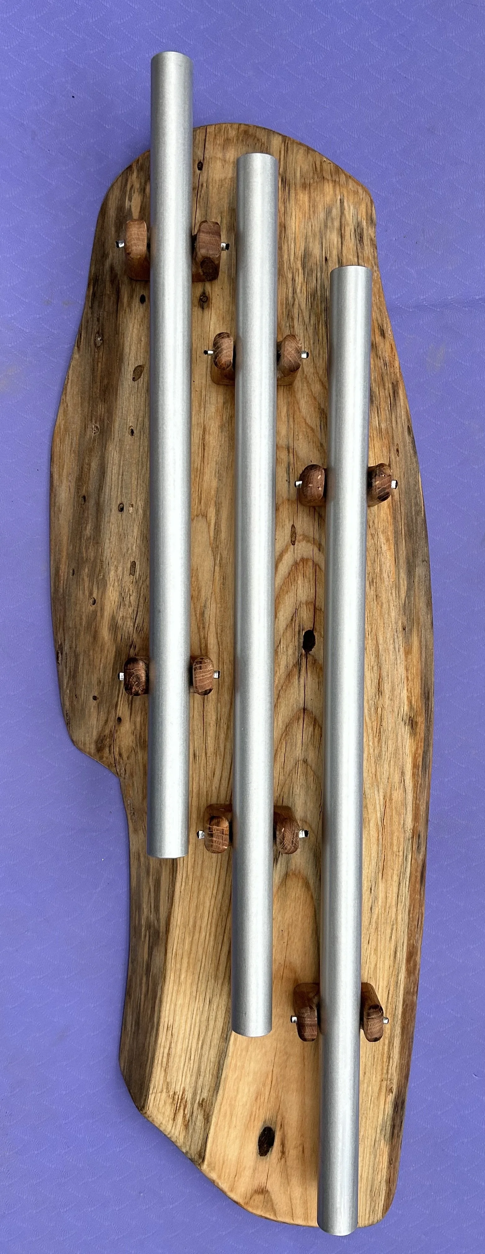 1” Aluminum pipe, precisely hand tuned with Just Intonation, allowing the notes to combine in pure harmony. E 4 triad, combining the E, major 3rd, and perfect fifth. Mounted on Live edge cedar with repurposed oak barn wood for the cradles. Can be hung on a wall or laid flat to play. $300